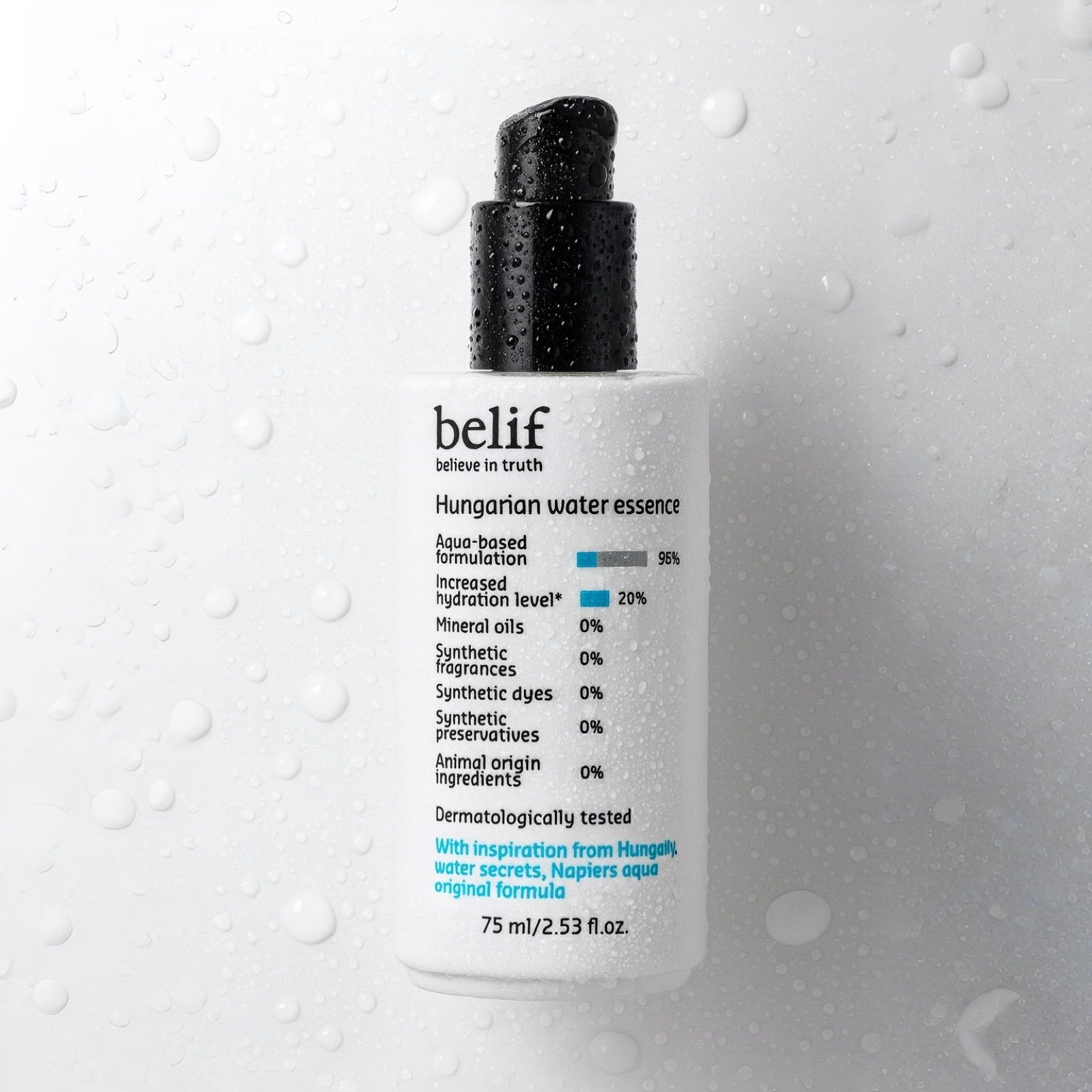 Belif – Hungarian Water Essence is a refreshing, water-light essence inspired by ancient Hungarian water beauty rituals, designed to hydrate deeply while maintaining a breathable, non-sticky feel on the skin.