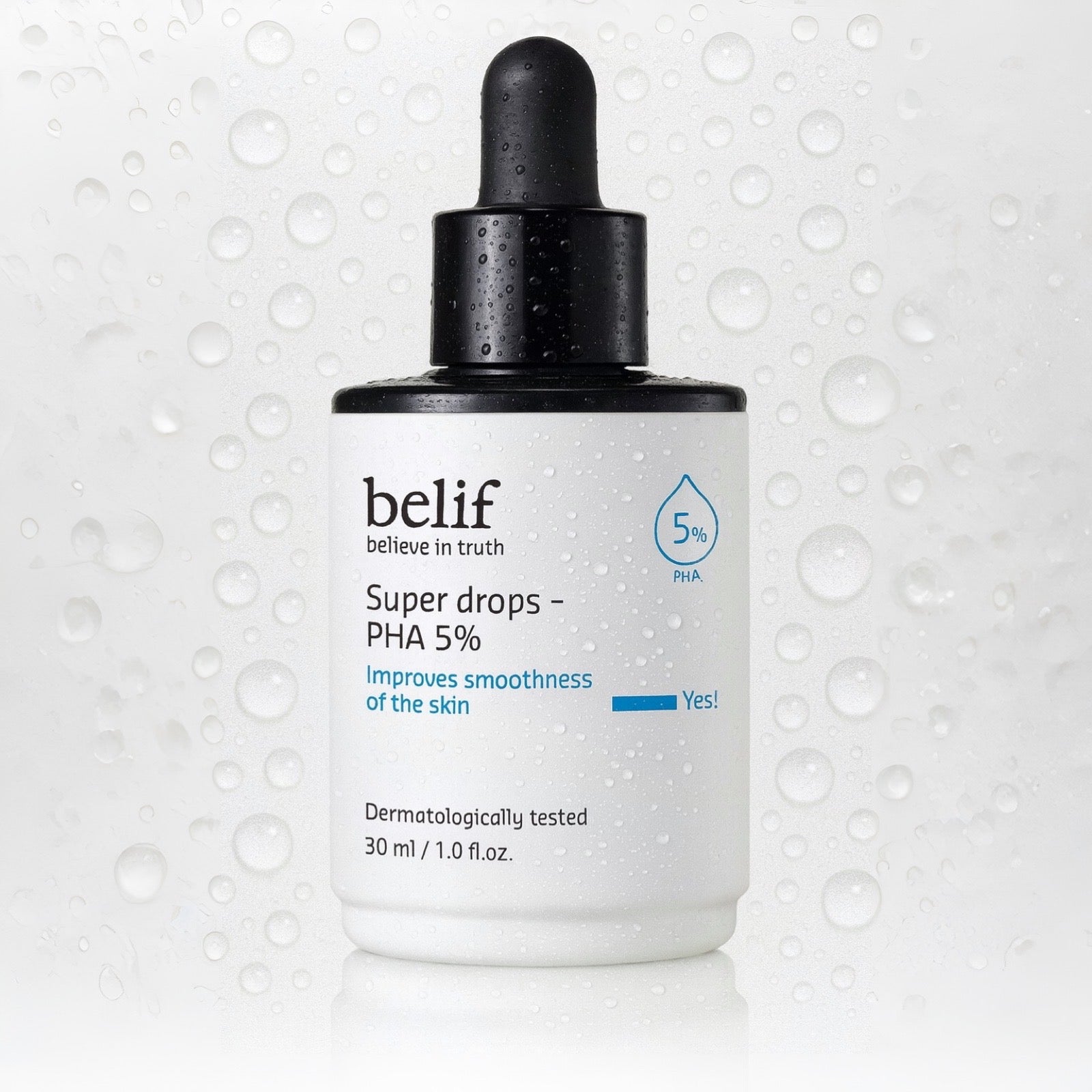 Belif – Super Drops PHA 5% is a mild exfoliating serum designed to remove dead skin cells, smooth texture, and brighten dull areas using skin-friendly PHA technology.
