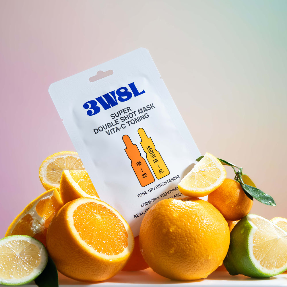 The 3W8L Super Double Shot Mask Vita-C Toning brightens the skin, improves tone, and enhances glow using Vitamin C-rich care.