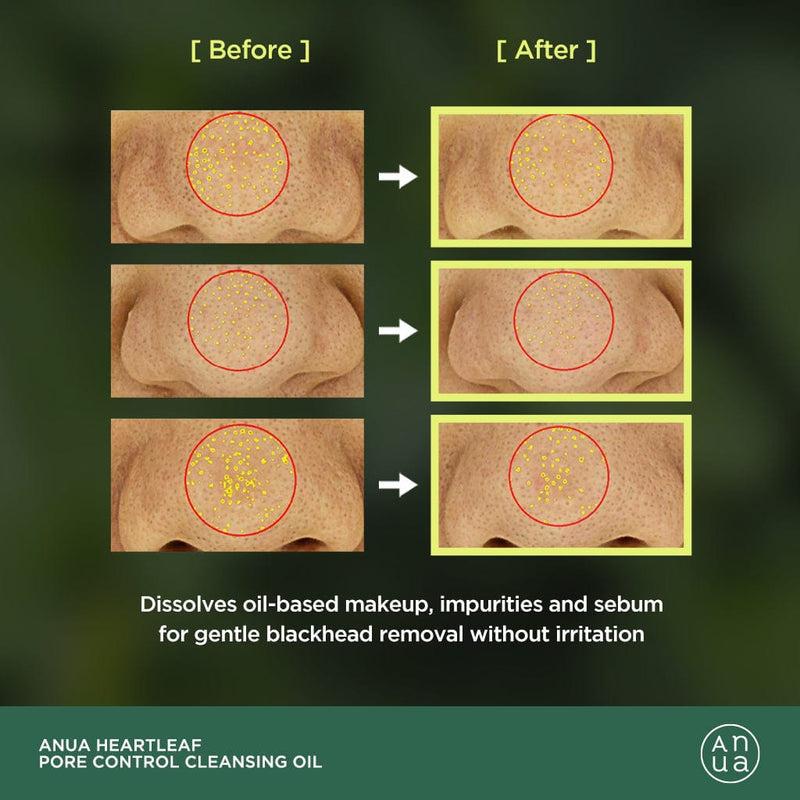The Anua Heartleaf Pore Control Cleansing Oil removes makeup, clears clogged pores, and balances oil levels with Heartleaf extract for fresh, smooth, and calm skin.