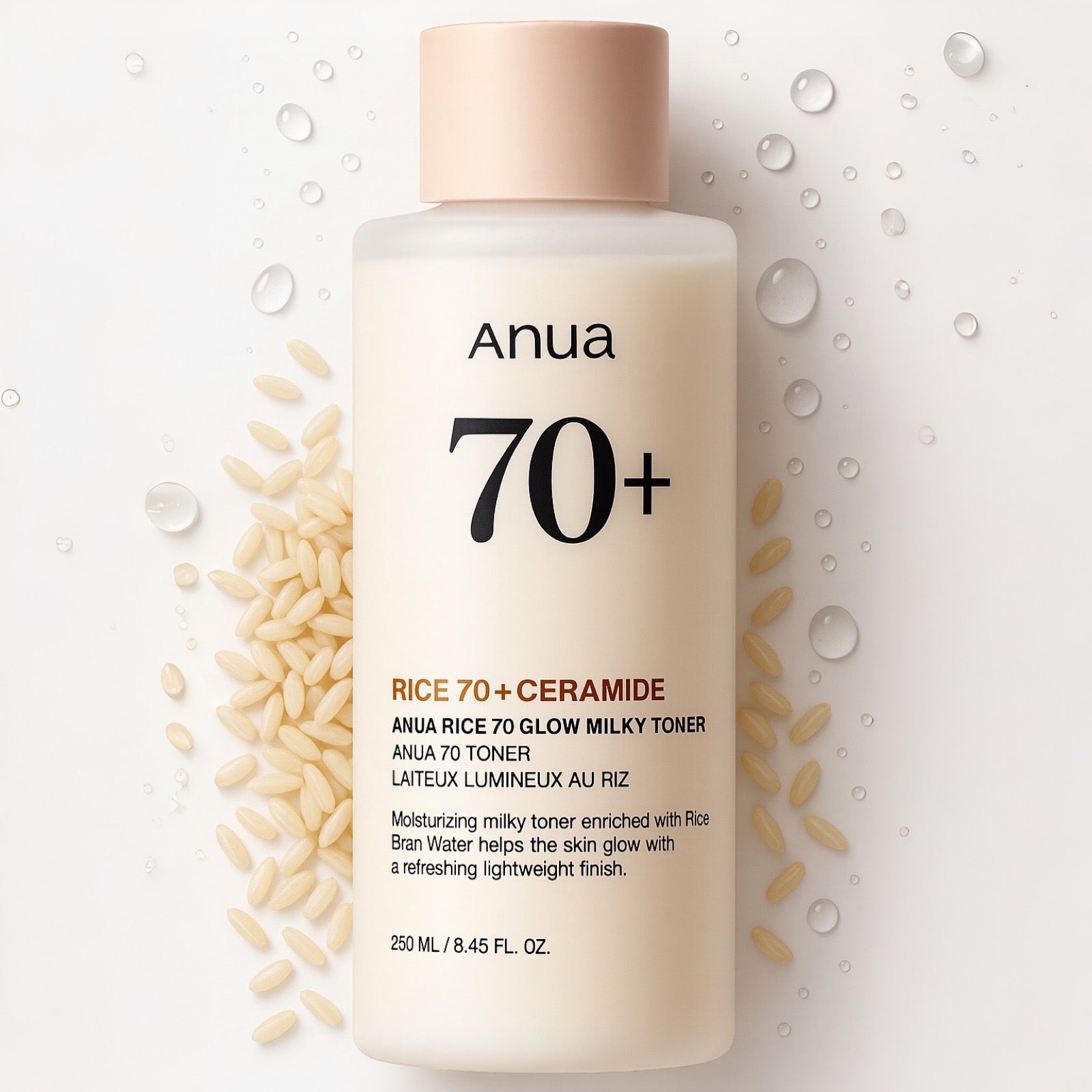 The Anua Rice 70 Glow Milky Toner hydrates, brightens, and refines skin texture with 70% rice extract for smooth, radiant, and naturally glowing skin.