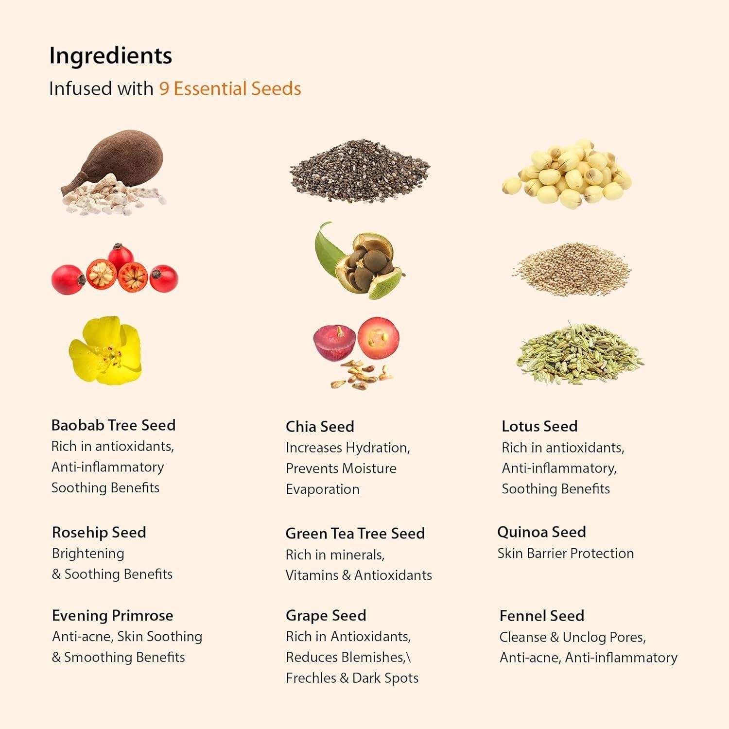 Adansonia Digitata Seed Extract (10.302%), Butylene Glycol, Camellia Sinensis Seed Extract (8.585%), Oenothera Biennis (Evening Primrose) Seed Extract (8.585%), Foeniculum Vulgare (Fennel) Seed Extract (8.585%), Salvia Hispanica Seed Extract (8.585%), Nelumbo Nucifera Seed Extract (8.585%), Chenopodium Quinoa Seed Extract (8.585%), Vitis Vinifera (Grape) Seed Extract (8.585%), Rosa Canina Seed Extract (8.585%), 1,2-Hexanediol, Niacinamide, Glycereth-26, Water, Betaine, Hydroxyethyl Acrylate/Sodium Acryloyldimethyl Taurate Copolymer, Allantoin, Disodium Edta, Xanthan Gum, Leuconostoc/ Radish Root Ferment Filtrate, Polyglutamic Acid, Citrus Grandis (Grapefruit) Peel Oil, Candida Bombicola/Glucose/Methyl Rapeseedate Ferment, Glycerin, Argania Spinosa Kernel Oil, Olea Europaea (Olive) Fruit Oil, Pancratium Maritimum Extract